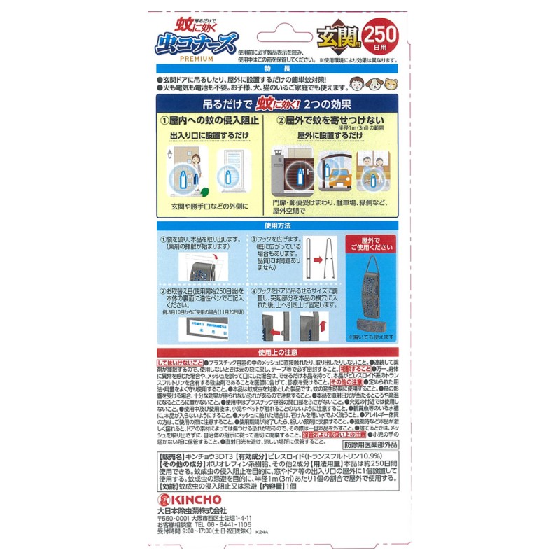 蚊に効く虫コナーズプレミアム玄関用>●有効成分…ピレスロイド(トランスフルトリン10.9%)●その他の成分…ポリオレフィ