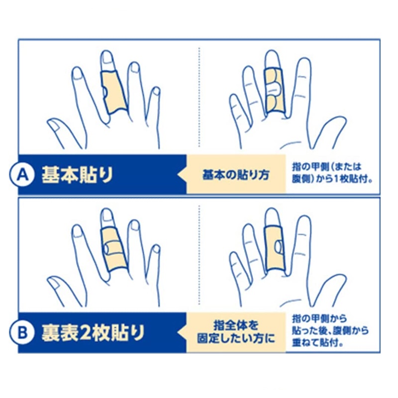 指関節に貼りやすい特殊形状なので一人で「サッと貼れて簡単きれいに固定」。