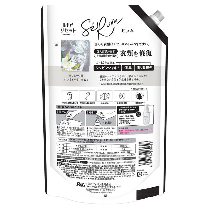 - 界面活性剤(エステル型ジアルキルアンモニウム塩)、安定化剤、繊維ケア補助剤、香料