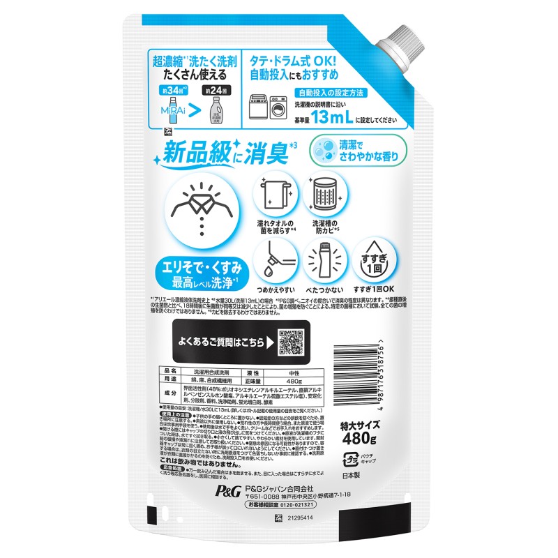 - 界面活性剤(48%:ポリオキシエチレンアルキルエーテル、直鎖アルキルベンゼンスルホン酸塩、アルキルエーテル硫酸エステル塩