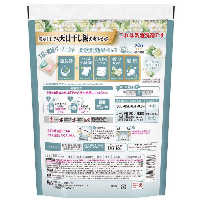 エチレンアルキルエーテル)、安定化剤(グリセリン、プロピレングリコール)、香料、分散剤、金属封鎖剤、洗浄助剤、酵素、柔軟