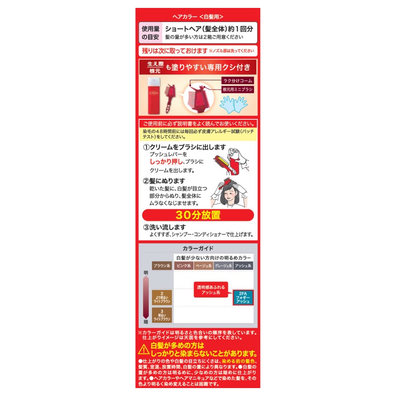●まぜる手間なし、簡単ワンプッシュ。・自然なツヤを感じる美しい染め上がり。
