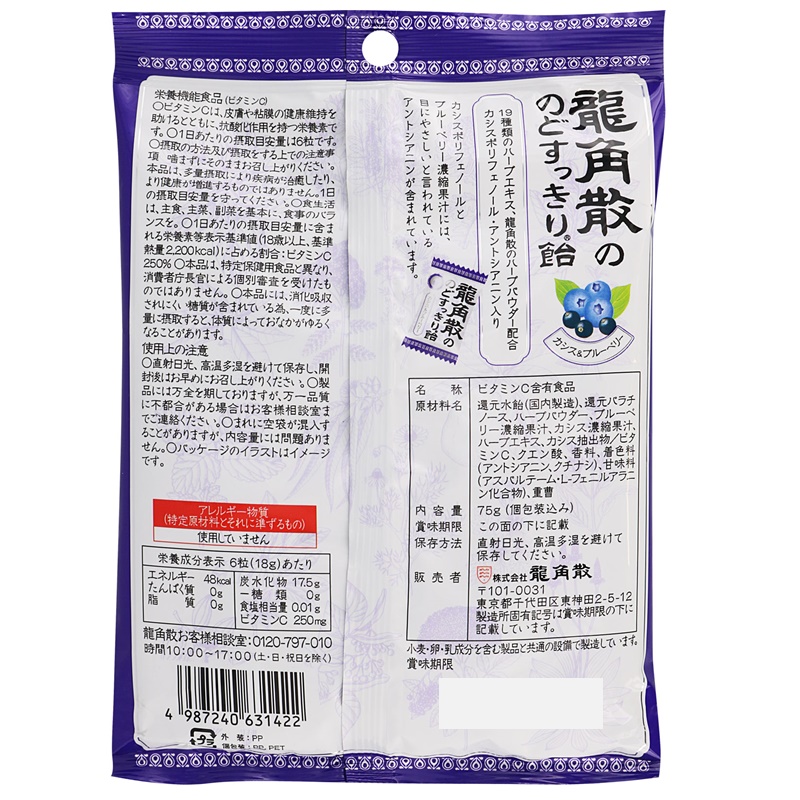 - 還元パラチノース、還元水飴、植物油脂、ハーブパウダー、ブルーベリー濃縮果汁、カシス濃縮果汁、カシス抽出物、ハーブエキス、