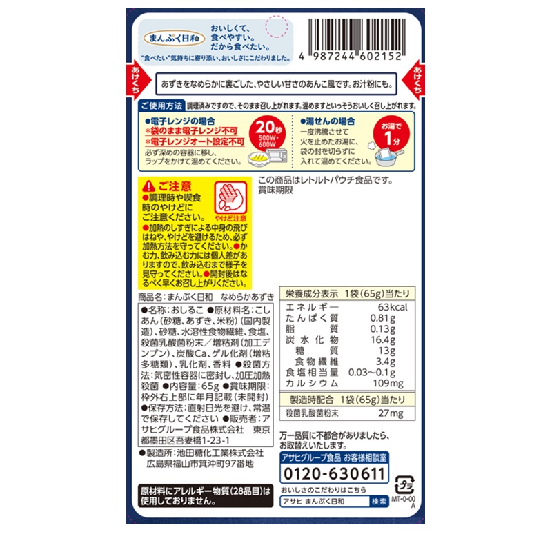 あずきをなめらかに裏ごした、やさしい甘さのあんこ風です。ほっこりやわらかなあずきの甘みで、お汁粉にもおすすめです。