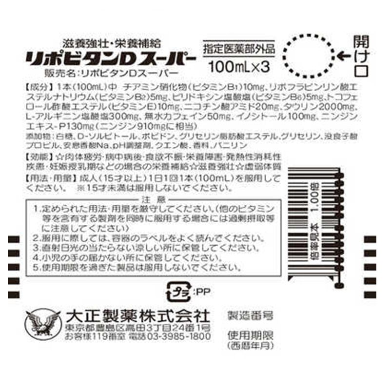 タウリン2000mgに、人参910mg(原生薬換算)、ビタミンEなどを配合したドリンク剤です。