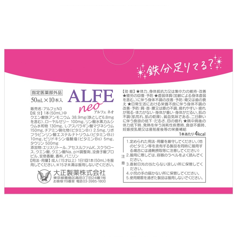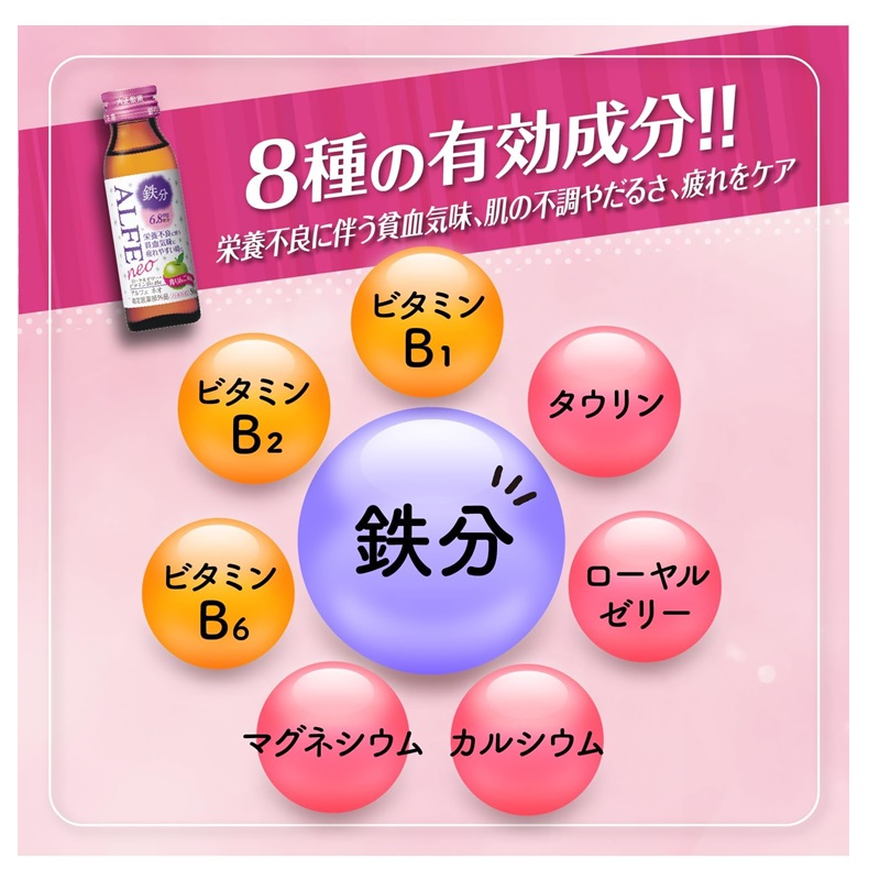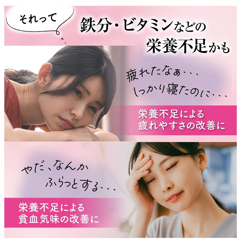 女性に不足しがちな鉄分をはじめ、ビタミンB1・B2・B6、マグネシウム、カルシウム、ローヤルゼリー、タウリンを配合し、栄