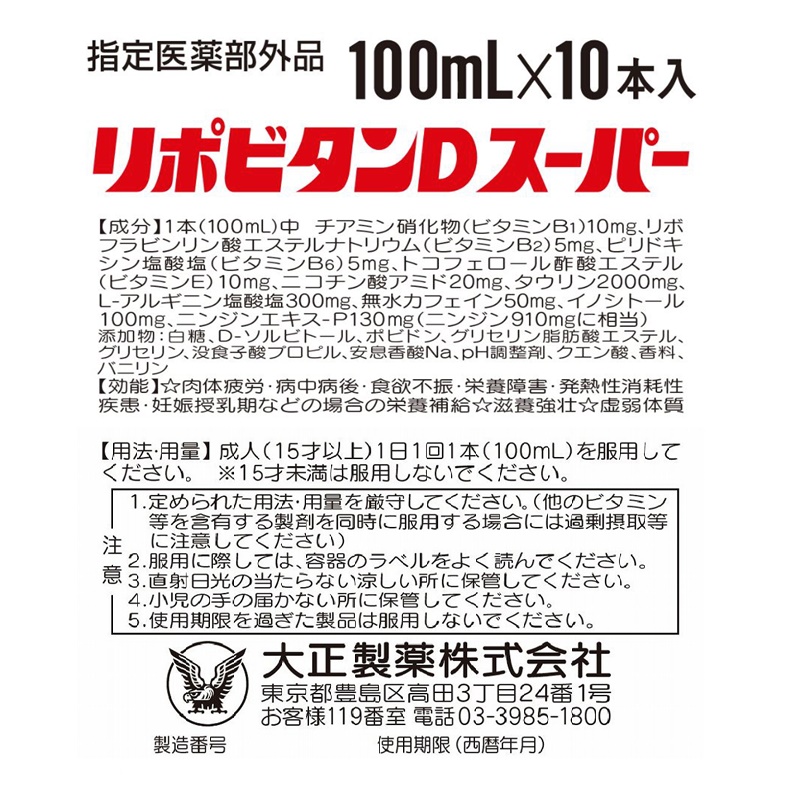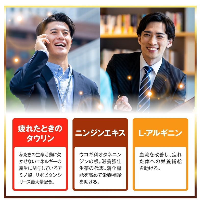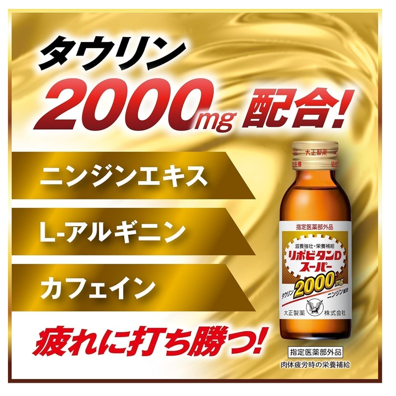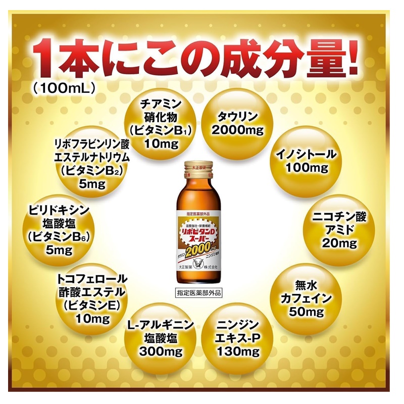 タウリン2000mgに、人参910mg(原生薬換算)、ビタミンEなどを配合したドリンク剤です。