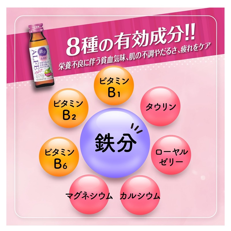 女性に不足しがちな鉄分をはじめ、ビタミンB1・B2・B6、マグネシウム、カルシウム、ローヤルゼリー、タウリンを配合し、栄