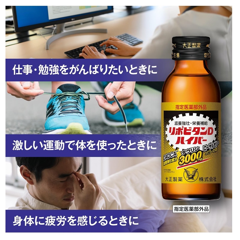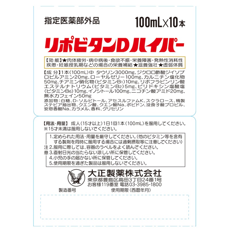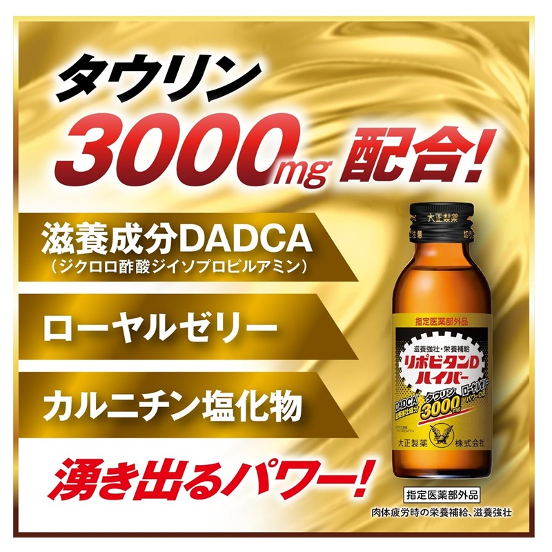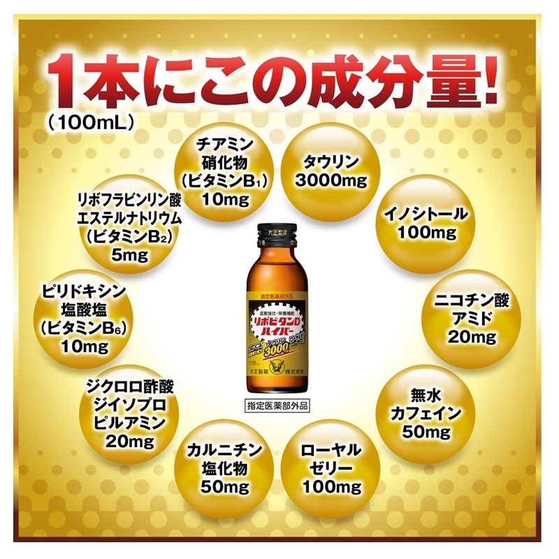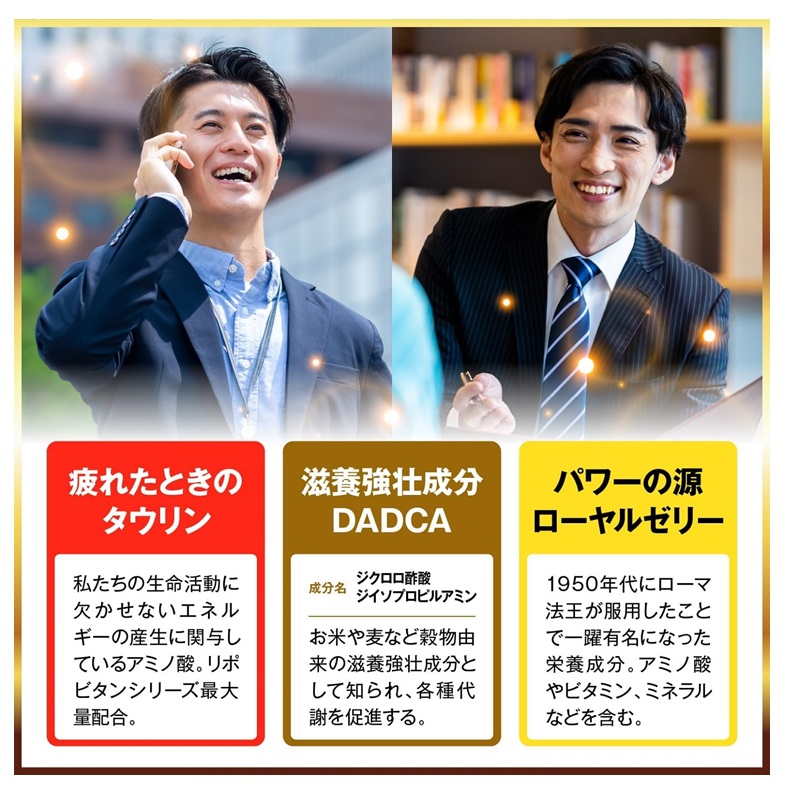 タウリン3000mg、DADCA(ジクロロ酢酸ジイソプロピルアミン)20mg、ローヤルゼリー100mgなど有効成分を10