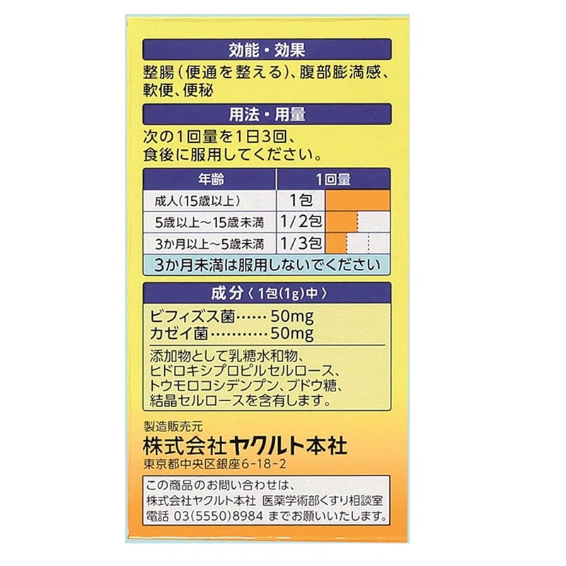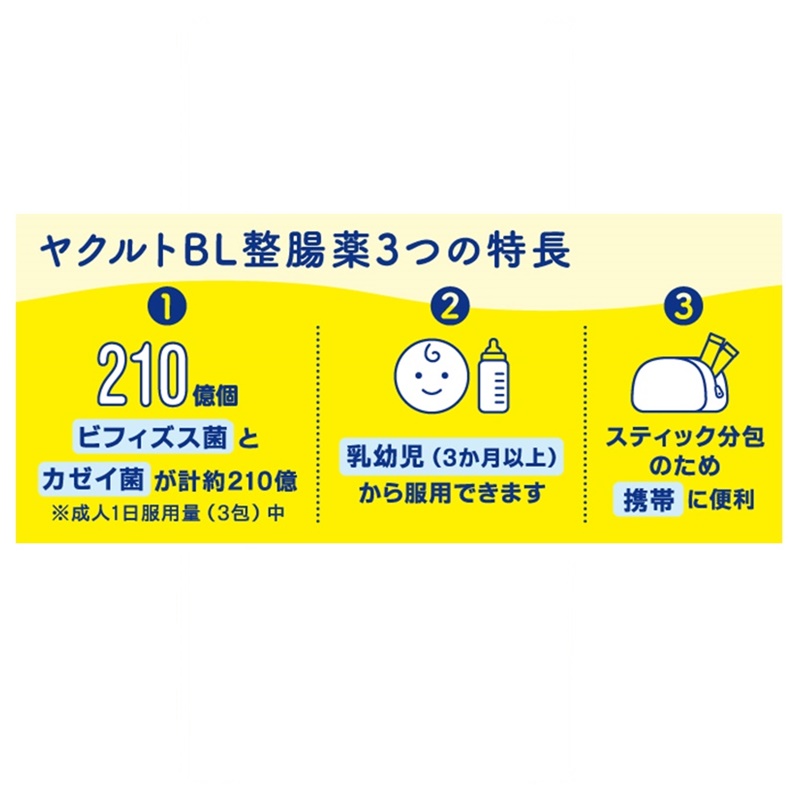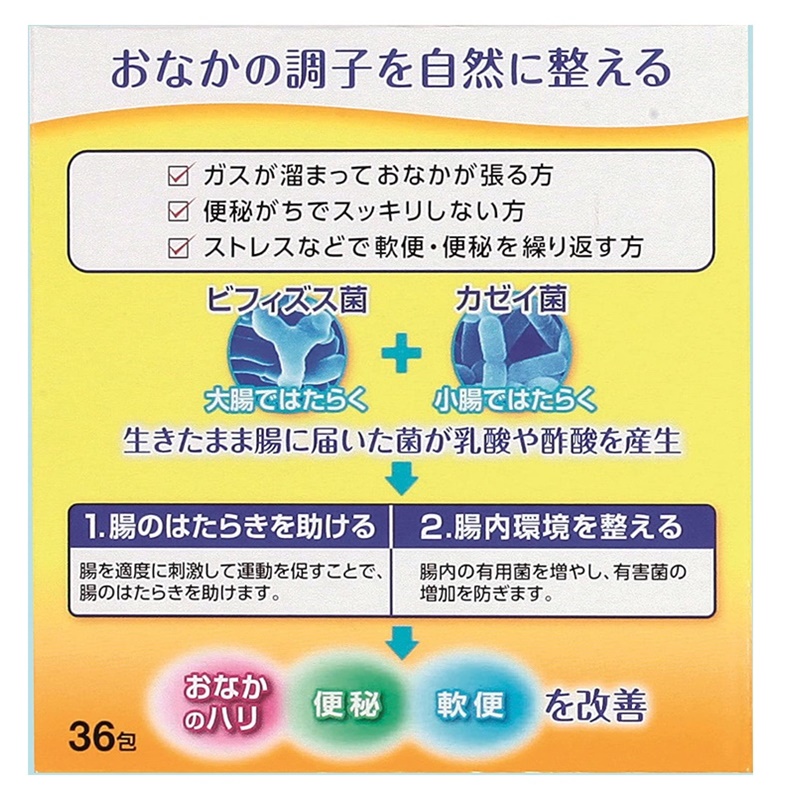 ビフィズス菌とカゼイ菌(乳酸菌)が成人一日あたり服用量の3包中に合せて約210億コ含有しています。